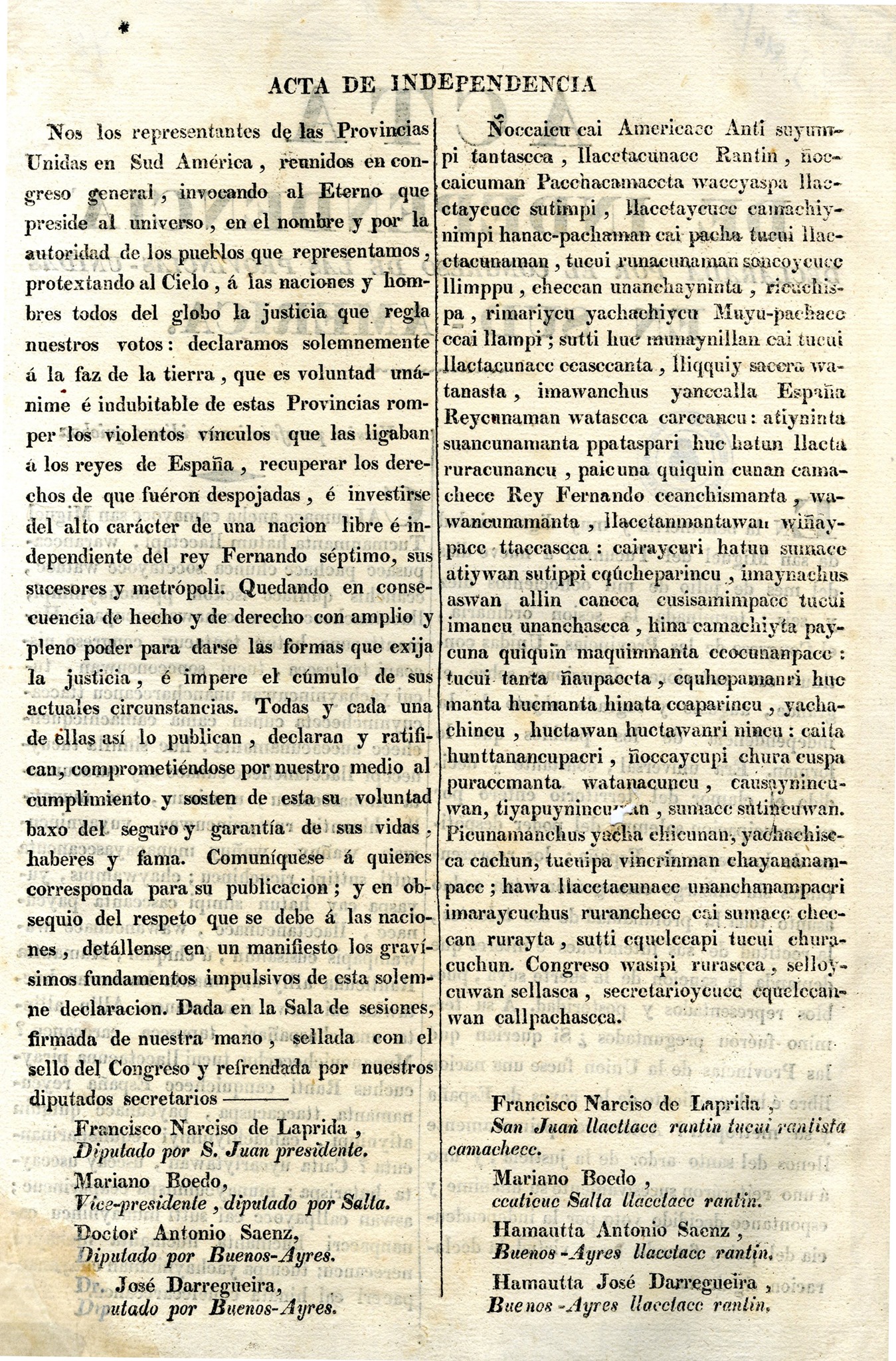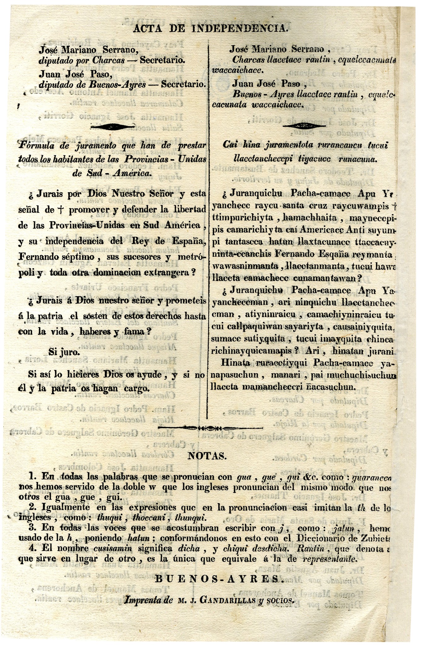 Cu sumace ancha camayoce san Mi guel Tucmanmanta hatum llacctapi, warancca= pusacc pachace chunca socctayocc watáec , ccanchis quillace isckon "ppunchaynimpi, Jacctanchecc:raycu cchawanancupaco Ha mauttacuna. hatun: tantacuy , congreso nis- ecapi tantascca , tucui _soncconcuwan , tu- cui yachaynincuwan unancharccancu ttacca- cuynincheccta cunan cama camachicquen- chece auccacunamanta : huc similla tucuy= neccpi llacctanchece eunaee eay ruracunan= ta” munasecaneu , uyaricun: , ue. munays Ha hinantiú ruraynincuwan , yuyaynincu- wan, Wañuy,, wañuy imunapayasccancuta sutti_ sutfipi. ricuohincu ; chaywampis, yu- yaspa cay hatun simipi casceanta paycu- nace , llaeetancunace , Wawancunacc Wá= wampapis cusisamin ; ú chiquin , Hamautta Ranticuna alliy dlliymanta huctawan huce- tawan cai hawa rimapecaneu. Allin allin- 'ta unanchaspañari ,.¿tapuseca . carccancu. ? Munanquichecechu tucui llacctacana piray= cuchus Ranti canquichecc España reycu- namanta ttaccacuspa , paycunace quiquin atiyninpi., camachiynimyi cquheparinan- cuta ? Caita uycariylawan s noa y USRCAS ta hatarispa : munaycunnispa eeaparineue ; aswan callpayoce cai sutti munaynincu ca- ñanpaceri Huemanta “huemanta munaycu nerccancu; tucuipa yachayninman chayanar- paceri cai hinata equelecarccanca, _Noscalen cai o a suy Nos los representantes de las -Provincias| Unidas en Sud América, Femnidos en con- yu caicuman a waccyaspa s ctaycucc sutimpi, llacctaycuce camachiy- nimpi hanac-pachzman cai pacha tucui llae- 'ctacunaman , tucui punaeunamaq soncoycuce greso” general; invocando, al Eterno que preside al universo., em el nombre y por la autoridad de los pueblos que representamos , protex xtando al Cielo, á las naciones y hom- bres todos del globo la justicia que regla nuestros votos: declaramos solemnemente á la faz de la tierra , que es voluntad -uná= nime é indubitable de estas Provincias rom- per “los: violentos: vínculos que las ligaban; á los reyes de España , recuperar los dere- chos de que fuéron despojadas > é investirse del alto carácter de una nacion libre é in- dependiente del rey Fernando séptimo, sus sucesores y metrópoli: Quedando, en conse- "cuencia de hecho" y de derecho: con amplio: y “pleno poder para darse làs formas que exija la justicia , é impere el cúmulo de sus actuales circunstancias. Todas ` y cada una de £llas así. lo, publican , declaran y ratifi- -cany comprometiéndose por nuestro medio al 'cumplimiento. y::sosten: de ::esta»su- voluntad baxo' del seguró y” garantía: desus «vidas , haberes y fama. Comuníquese "á quienes corresponda para su publicación ; y en ob- sequio del respeto que se debe á las nacio- nes ,. detállense ¿en un manifiesto los graví- - simos:fandamentos impulsivos de esta solem- ne declaracion.:Dada en la Sala de sesiones, firmada de nuestra mano , “sellada con: el ` sello del Congreso y pa por Srs diputados secretarios — : Francisco: Narciso de Laprida » Diputado por S, Juan presidente, Mariano Boedo, : Vice-presidente , diputado" por Salta, Doctor Antonio. Saenz, “ga por Buenos- Ayres. ° José Darregúcira, : putado por Buenos- Ayres. llimppu , eheccan unanchayninta , ricuchis> > pa, rimariycu yachachiycu Muyu-pael hace ccai llampr; sutti hué munaynillan cal tucui Mactacunace ceasccanta , lliqquiy sacera wa- tanasta , imawanchus yancealla España Reycunaman watascca carccancu: atiyninta suancunamanta ppataspari huc hatun llacta ruracunancu , paicuna quiquin cunan cama- chece Rey Fernando ceanchismanta , wa- wancunamánta ,:lacetanmantawan wiñay- pace «ttaccascca : cajraycuri hatua sumace atiywan sutippi egúcheparincu , imaynachus aswan allin .caneca eusisamimpaco tucui imancu unanchaseca , Hina camachiyta pay- cuna quiquin maquinmanta ceócananpace : tucui- tanta ñaupaecta , equhepamanri hue manta huemanta hinata ceaparincu , yacha- Chincu , huctawan huctawanri nincu : caita nto , ¡Hoccaycupi chura: euspa puracemanta, watanacuncu, Causpynincu- wan, tiyapuynincu“an , sumace sútitcuwan. Picunamánchus yacha einen yadhachise- ca cachun; tuenipa vincrinman chayanánam- pace ; hawa liacetaeunaee uranchanampacri imaraycuchus' ruranchece cai sumaee chec- can rurayta , sutti equelecapi tucui chura- cuchun. Congreso wasipi ruraseca , selloy= cuwan sellasca , e sonu equelecale wan Ca sapay ë Francisco Narciso de Laprida, San Juan llactlace rantina tucui santista camachece, Mariano Bocdo 3 ccaticuc Salta llacclace rantin. Hamautta Antonio Saenz , Buenos - Ayres lecclace rantín, Hamautta José Darregueira , Buenos - Ayres llaeelace rantin, = | j Mariano Serrano , Charcas llacetace rantin:, cquelecaciónala waccatchace. - ` * 5 - Juan José Paso , ] Buenos - Ayres llacetace rantin , equeles | eacunata rwaceaichace, Cat hina juramentola rurancance tucus Ulacctancheccpi tiyacuec runacuna. José Mariano Serrano, diputado por Charcas — Secretario. Juan José Paso, ` diputado de Buenos- Ares — Secretario. Fórmula de juramento que han de prestar todos los habitantes de las Provincias - Unidas de Sud - América. 2 ¿ Juranquichu Pacha-camace Apu Yz. yanchece raycu-santa cruz raycuwampis + ttimpurichiyta , hamachhaita , maynecepi- pis camarichi y ta caí Americace Anti suyun pi tantascca hatum. Haxtacunaco ttaccacuy: nintasccanchis Fernando Esqaña rey manta, wawasninmanta , llaeetanmanta , tucui hawa | Haceta:eamacheco conamantawan ? ¿ Juranquicha Pacha-camace Apu Ya. yanchecoman , ari ninquichu' Hacctanchee eman , atiyninraicu , camachiyninraicu tu: cui callpaquiwan:sayariyta , causainiyquita, sumace sutiyquita:, tucui imayquita ehinca: richinayquicamapis 2 Ari, hinatan jurani. Hinata ruracotiyqui Pacha-camace ya- napasuchun , mamari, pai mmuchuchisuchua Haccta mamancheccri ñacasuchun.