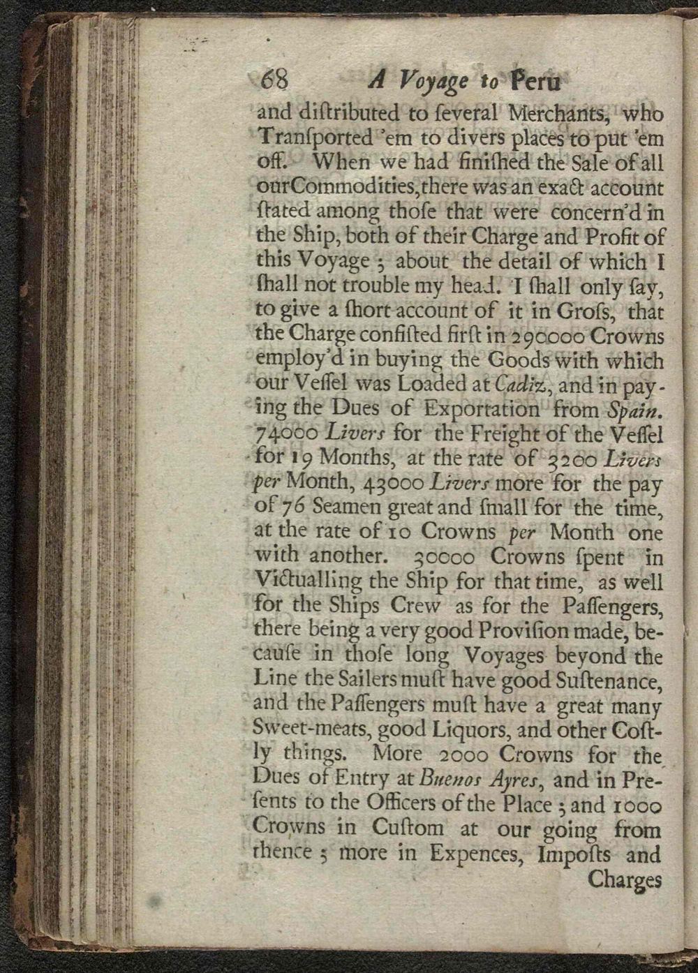 distribuidas entre varios comerciantes, quienes las transportaron a diversos puntos para venderlas.Cuando terminamos la venta de todas nuestras mercaderías, se hizo una declaración exacta entre todos los que tenían intereses en el barco, tanto de los gastos como de las ganancias de este viaje, acerca de cuyo detalle no me ocuparé. Solo diré, para dar de ello una idea en globo, que los gastos consistían primero en doscientas noventa mil coronas, empleadas en adquirir las mercaderías con las cuales fue cargado nuestro barco en Cádiz y en pagar los derechos de exportación desde España; 74.000 libras por el flete del buque durante diecinueve meses, a razón de 3.200 libras por mes; 43.000 libras más por el pago de setenta y seis marineros, grandes y pequeños, por ese mismo tiempo, a razón de diez coronas por mes, uno con otro; treinta mil coronas gastadas en abastecer el buque durante ese tiempo, tanto para la tripulación cuanto para los pasajeros, ya que hay que hacer muy buenas provisiones, porque en esos largos viajes más allá de la línea, los marineros deben tener buena alimentación y los pasajeros deben tener mucha abundancia de confituras, buenos licores y otras cosas costosas. Dos mil coronas más por los derechos de entrada a Buenos Aires y en presentes para los oficiales de la plaza; y mil coronas de derechos de aduana al salir de allí: más en gastos, impuestos y fletes