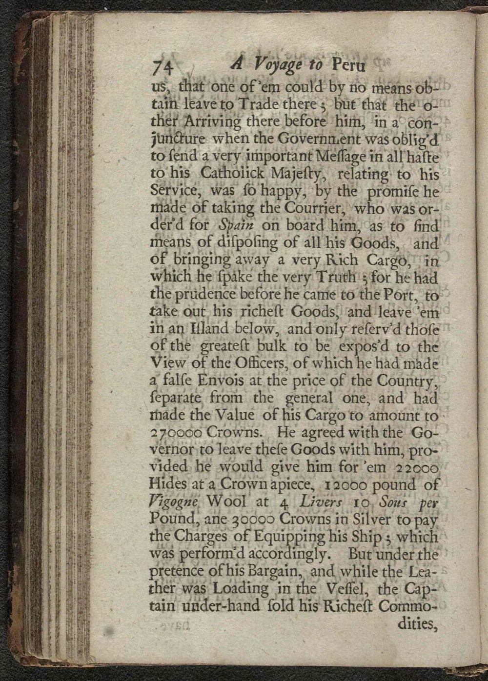 que uno de ellos no pudo obtener por ningún medio licencia para comerciar allí, pero que el otro, habiendo llegado antes, en una oportunidad en que el gobierno se veía obligado a enviar un mensaje muy importante a su Católica Majestad, relacionado con el servicio, tuvo la suerte, por la promesa que hizo de llevar a su bordo el correo que se despachaba a España, de encontrar medios de disponer de todas sus mercaderías y de traer de vuelta un rico cargamento. Con lo cual decía la verdad pura; porque tuvo la prudencia, antes de llegar al puerto, de desembarcar sus mercancías más ricas y dejarlas en una isla más abajo, reservándose sólo aquellas de más bulto para ser expuestas a la vista de los oficiales; de las cuales había hecho una factura falsa al precio del país, separada de la general, habiendo hecho que el valor de su cargamento ascendiera a 270.000 coronas. Convino con el en dejarle esas mercaderías, siempre y cuando le proveyera en cambio de 22.000 cueros a una corona la pieza, 12.000 libras de lana de vicuña a 4 libras 10 sueldos por libra y 30.000 coronas de plata para pagar los gastos de equipar su barco; lo que se realizó satisfactoriamente. Pero bajo el pretexto del trato y mientras cargaban en su barco el cuero, el capitán por bajo mano vendió sus más ricas mercancías