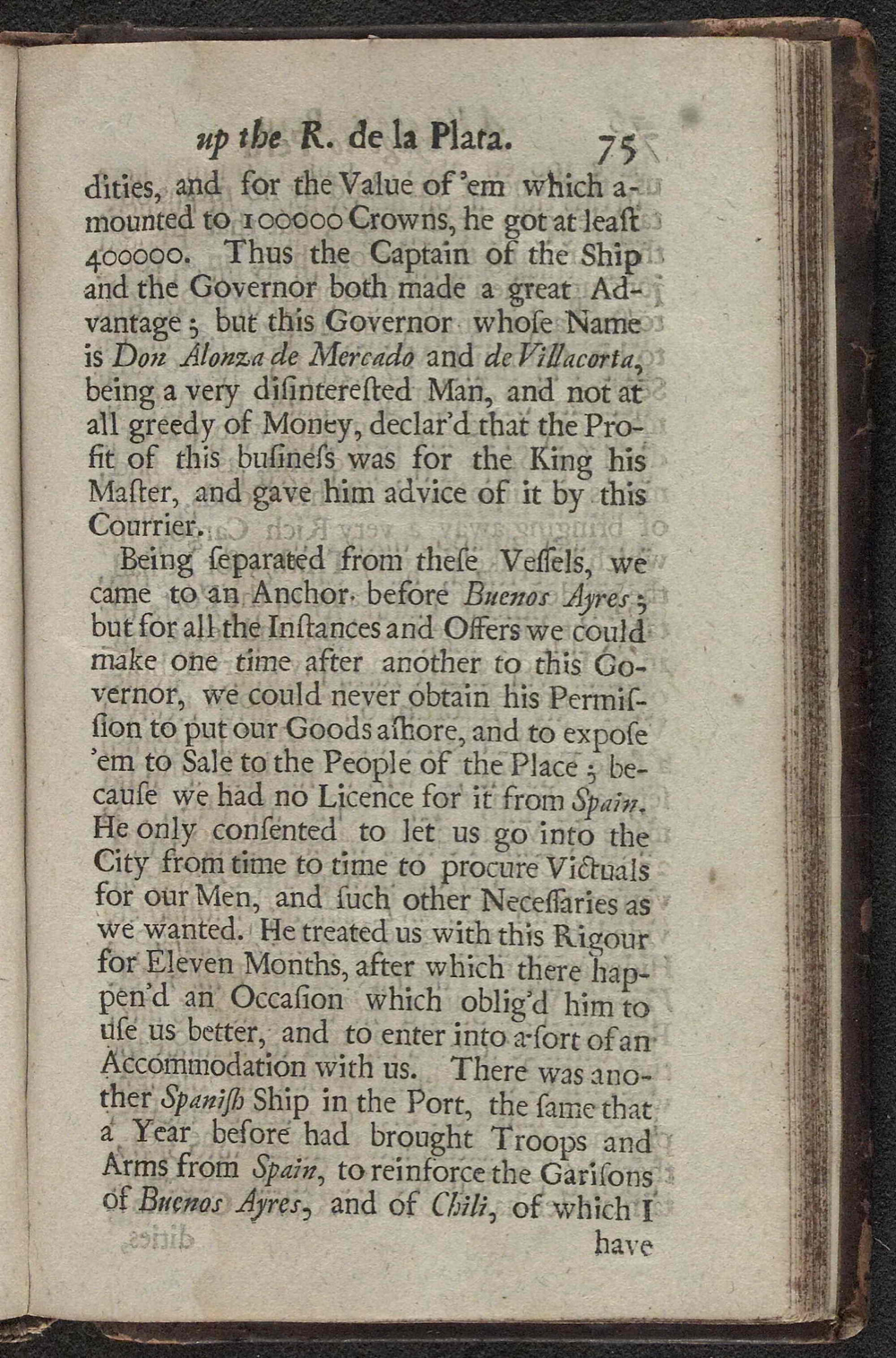 Separados de esos barcos, fuimos a anclar frente a Buenos Aires; pero a pesar de todas las instancias y ofrecimientos que pudimos hacer una vez tras otra a este , no pudimos obtener nunca su autorización para desembarcar nuestras mercaderías y exponerlas a la venta al pueblo de la plaza, porque para ello no teníamos licencia de España. Sólo consintió en dejarnos bajar a la ciudad de tanto en tanto, para procurar víveres para nuestros hombres y otras cosas por el estilo que necesitáramos. Nos trató con este rigor durante once meses, después de los cuales se presentó una ocasión que le obligó a tratarnos mejor y a entrar en una especie de arreglo con nos otros. Había otro barco español en el puerto, el mismo que un año antes había traído soldados y armas de España para reforzar las guarniciones de Buenos Aires y Chile, del cual