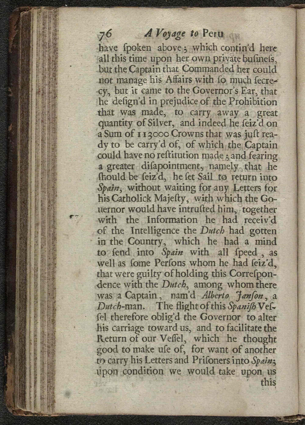 he hablado más arriba, el cual permaneció allá todo este tiempo atendiendo a su negocio particular; pero el capitán que lo comandaba no pudo realizar sus negocios con tantísimo secreto, sino que llegó a oídos del que tenía pensado, en contra de la prohibición que se había hecho, llevarse una gran cantidad de plata y en efecto se apoderó de una suma de 113.000 coronas, que estaban precisamente listas para ser llevadas, de las cuales el capitán no consiguió que se le hiciera restitución: y temiendo un mayor disgusto, principalmente que él mismo fuera apresado, izó velas para regresar a España, sin aguardar ninguna carta para su Católica Majestad, las cuales el le habría confiado; junto con la información que había recibido de las relaciones que los holandeses habían conseguido en el país, que tenía el propósito de enviar a España con toda prisa, como así también algunas personas que había apresado por ser culpables de mantener correspondencia con los holandeses, entre los cuales se hallaba un capitán holandés llamado . La fuga del navío español, por lo tanto, obligó al a alterar su conducta para con nosotros, y a facilitar el retorno de nuestro barco, del cual creyó bueno hacer uso, por falta de otro, para llevar sus cartas y prisioneros a España; bajo la condición de que tomaríamos sobre nosotros