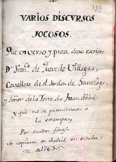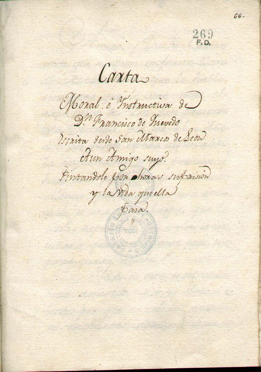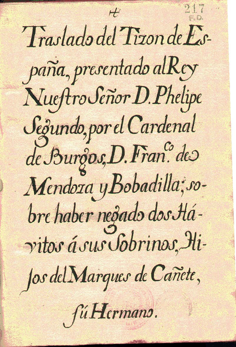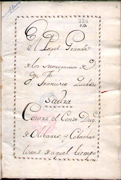 Yendo galanteando a vna Dama de Palacio vn gran Caua||llero en tiempo del Sr. Rey D. filipe 2o le mando la tal dama || que quitase avn Alguacil de Corte vn preso que llevaua; y || replicando el Cauallero, voluio à instar la Dama que la || obedeciese: hizolo quitando el preso à la justicia. el || Rey mando prender àla dama en Palacio y dejo libre || al Cauallero. ponderase en esta accion quan disculpable || es vn error cometido por empeño politico ò cortesano puesto || en vso pues obligò à Principe tan celoso dela justicia || à no castigar exceso cometido contra ella. Ocupa ff. 64 (tras 1 + 47, numeración propia)