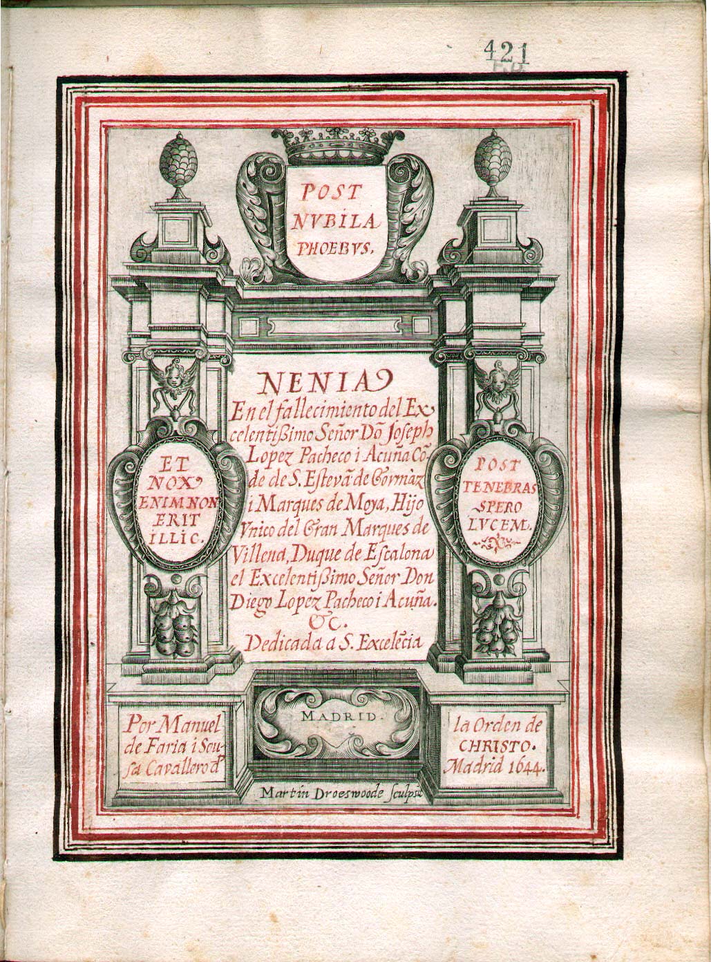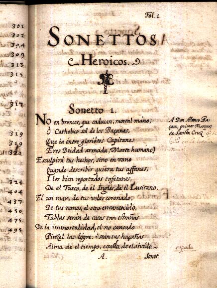 | Sonetto 1. | A Don Alvaro Ba:||çan, primer Marques || de Sancta Cruz | No en bronces, que caducan, mortal máno, | 1r |