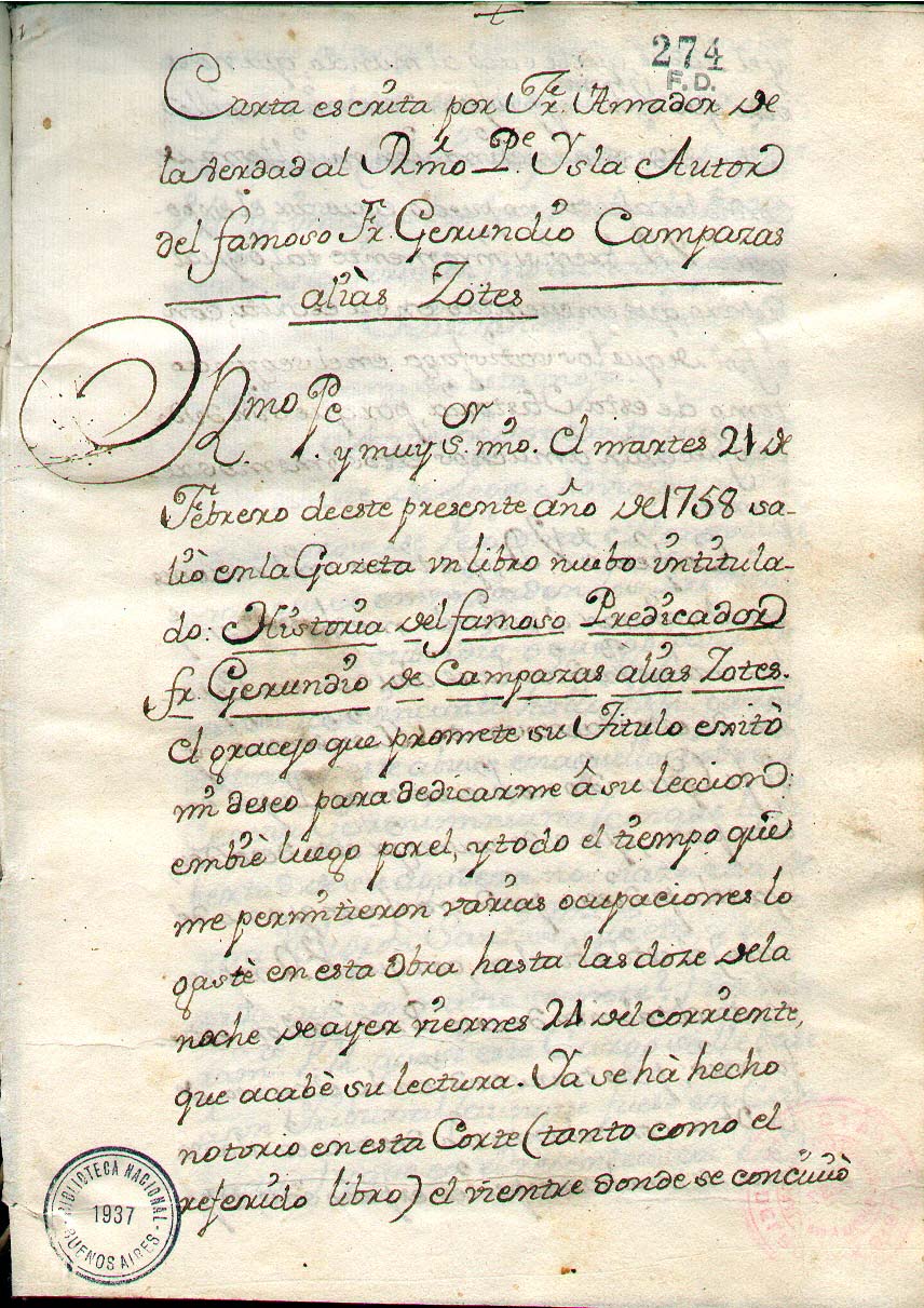 ff. 274v. Inicio de carta en prosa de letra posterior