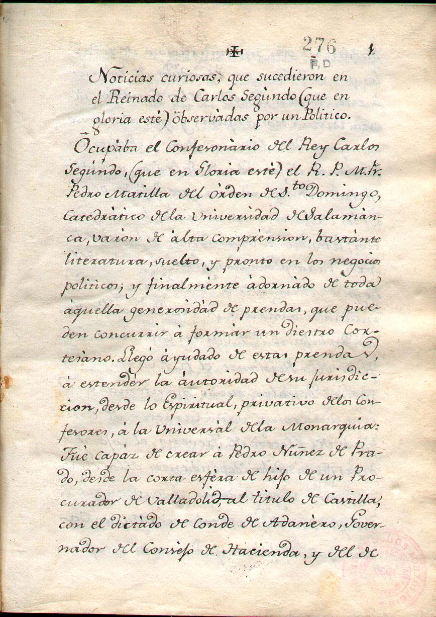 Yendo galanteando a vna Dama de Palacio vn gran Caua||llero en tiempo del Sr. Rey D. filipe 2o le mando la tal dama || que quitase avn Alguacil de Corte vn preso que llevaua; y || replicando el Cauallero, voluio à instar la Dama que la || obedeciese: hizolo quitando el preso à la justicia. el || Rey mando prender àla dama en Palacio y dejo libre || al Cauallero. ponderase en esta accion quan disculpable || es vn error cometido por empeño politico ò cortesano puesto || en vso pues obligò à Principe tan celoso dela justicia || à no castigar exceso cometido contra ella.