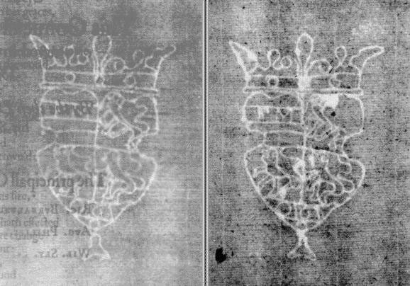 La filigrana o marca de agua, de la que incluimos un ejemplo, se realiza mediante un dibujo de alambre que se coloca en el molde del papel, para que impresione la pasta al fabricarlo. En la imagen ofrecemos los resultados de dos sistemas de registrar las filigranas de un libro. A la izquierda tenemos el sistema radiológico, a la derecha el digital. El radiológico registra también marcas de letras en la página, mientras que el digital permite obtener una imagen limpia y nítida. Las líneas verticales blancas más gruesas son los corondeles, las horizontales más finas y juntas los puntizones.