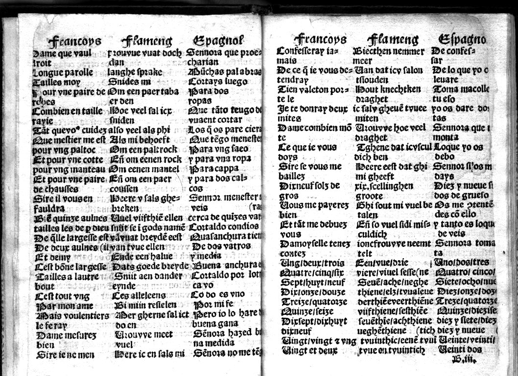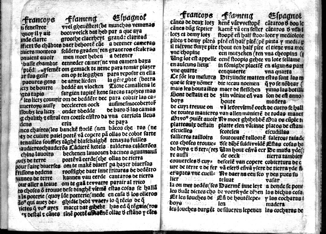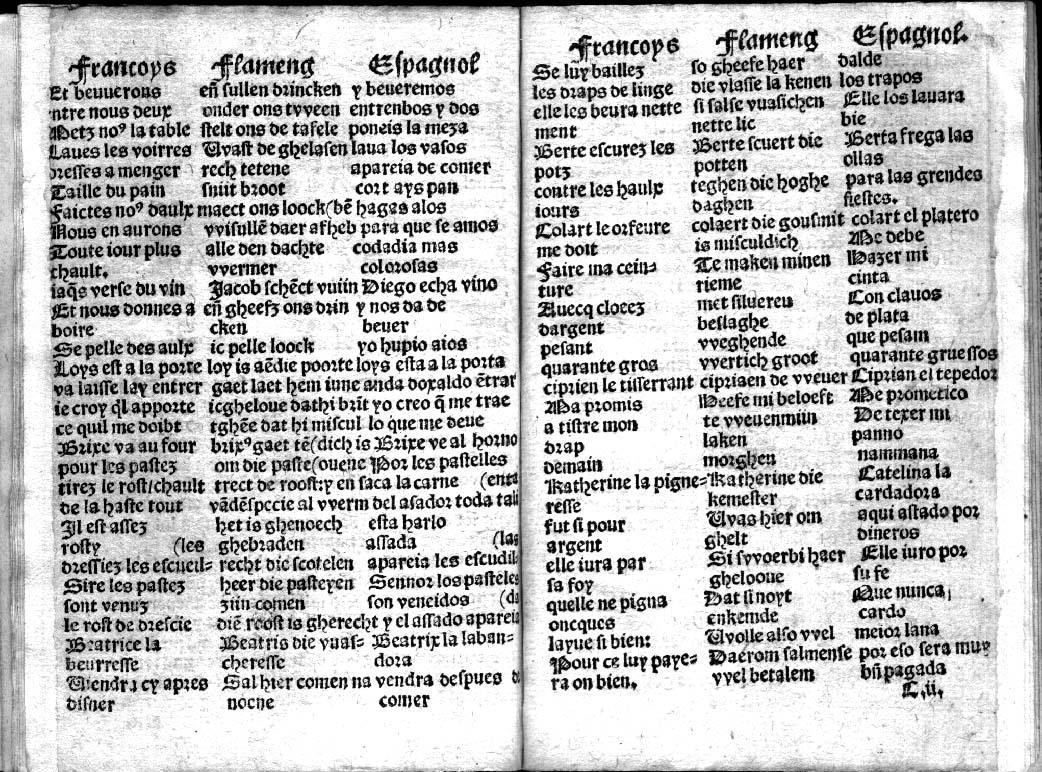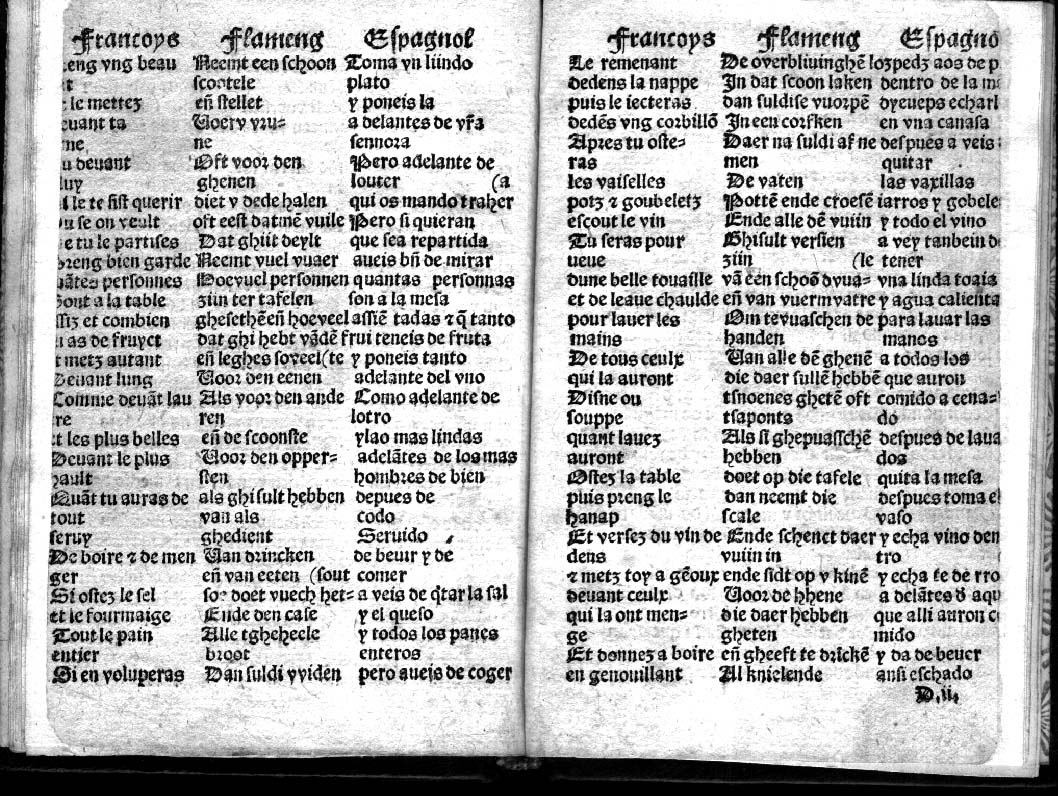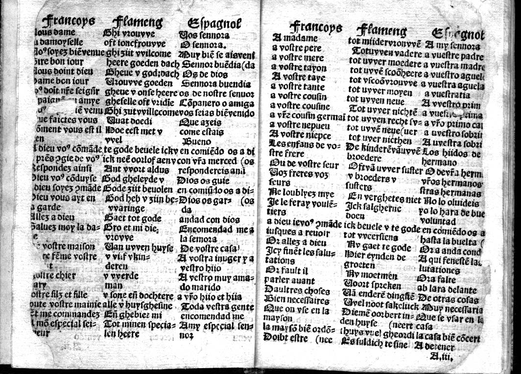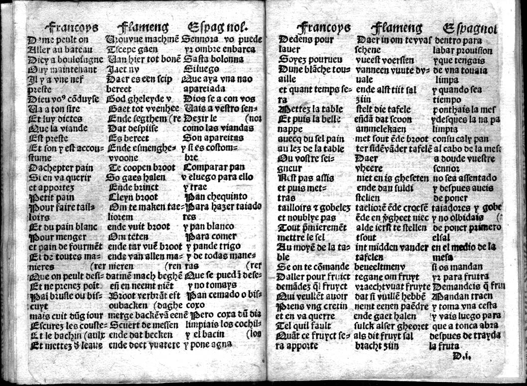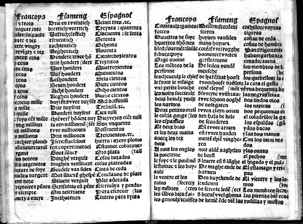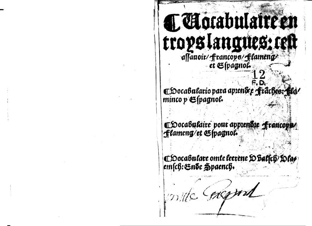 ΒΆ Vocabulaire en || troys langues: cest || assauoir / francoys / flameng / || et Espagnol. || Vocabulario para aprendre Frãches: Fla/ ||minco y Espagnol. || Vocabulaire pour apprendre Francoys/ || Flameng et Espagnol. || Vocabulare omte leerene Walsch / Vla||emsch: Ende Spaench.
