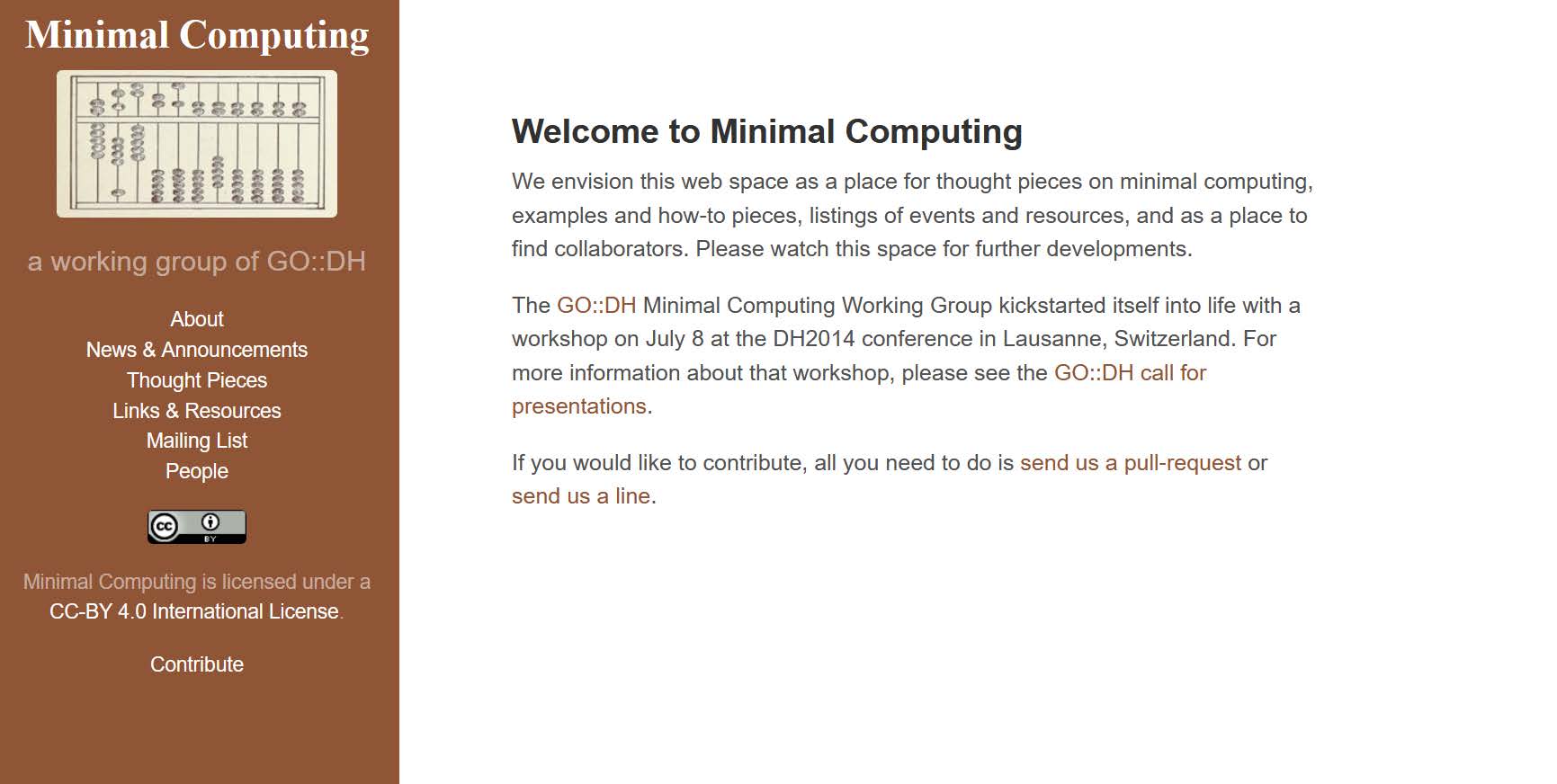 El sitio Minimal Computing es el espacio oficial del grupo de trabajo homónimo dentro de GO::DH. Funciona como un punto de encuentro para publicar ensayos, tutoriales, recursos, noticias y convocatorias sobre el enfoque minimalista en humanidades digitales.