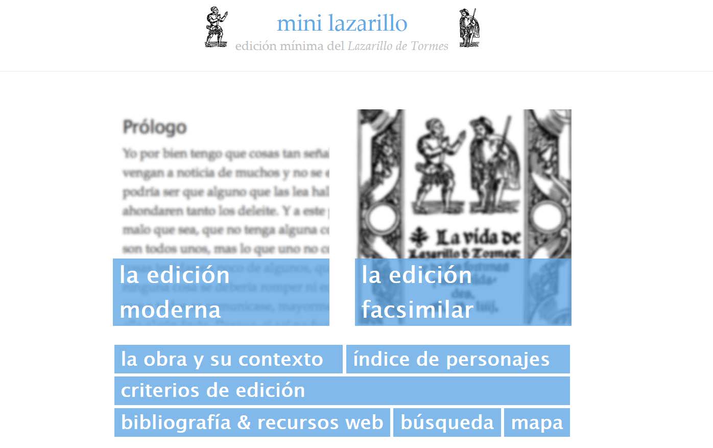 Si bien los primeros ejemplos de ediciones digitales realizadas con minimal computing optaron en su mayoría por Markdown como lenguaje de marcado a causa de su mayor simplicidad, desde temprano surgieron propuestas que buscaron incorporar la codificación de texto en XML-TEI, el estándar más utilizado para la Edición Filológica Digital y otras disciplinas de las Humanidad y las Ciencias Sociales, al proceso de publicación en sitios estáticos. En el contexto hispanohablante, un ejemplo temprano de esta tendencia es el mini lazarillo, una edición digital mínima del Lazarillo de Tormes (1554), creada por estudiantes del Departamento de Culturas Latinoamericanas e Ibéricas de la Universidad de Columbia. Ofrece una edición de lectura sencilla, una edición anotada y una versión facsimilar.