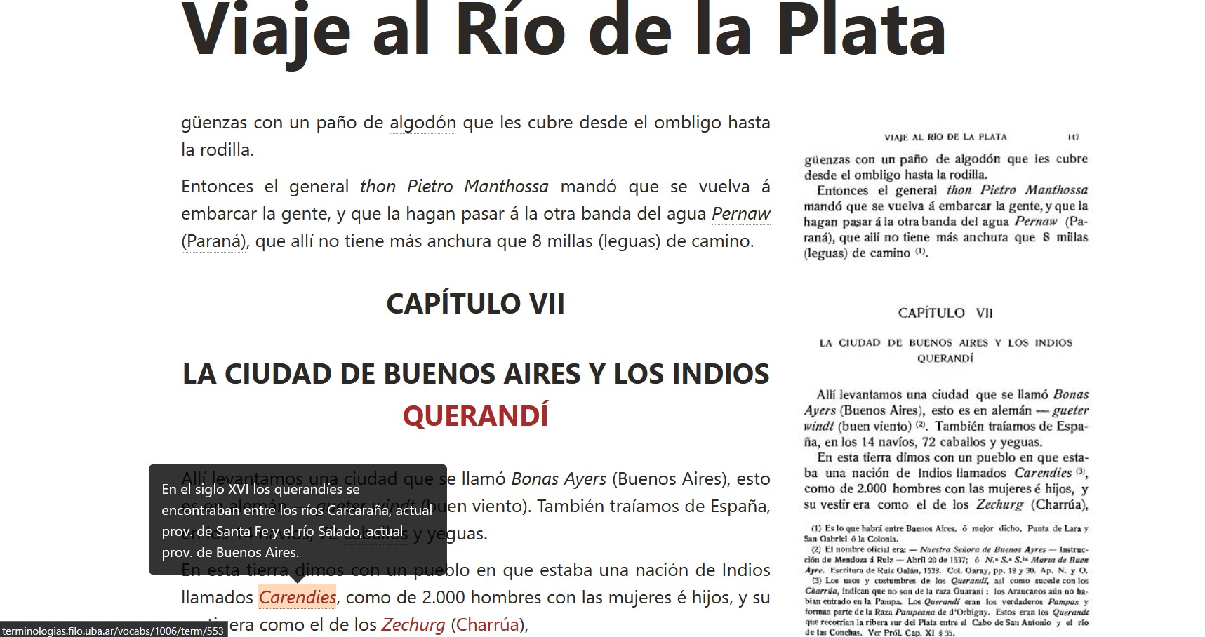 Un ejemplo de esta tendencia puede encontrarse en la edición digital enriquecida del Viaje al Río de la Plata (1534–1554) de Ulrich Schmidel, elaborada por el HDLab-CONICET, que acompaña la edición del texto con recursos como un mapa interactivo del itinerario desde Amberes hacia Suramérica, anotaciones, visualizaciones, notebooks y un vocabulario controlado: