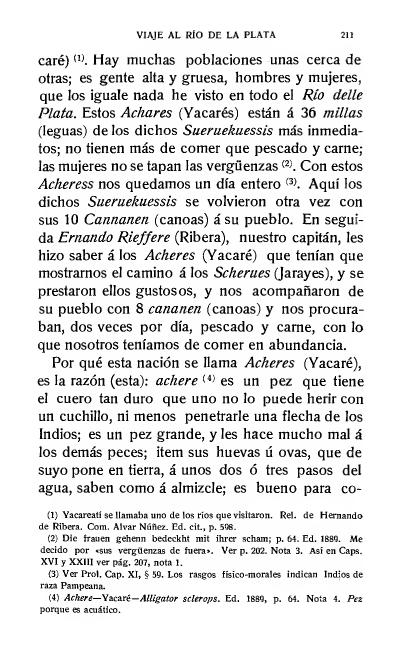 caré) Hay muchas poblaciones unas cerca de otras; es gente alta y gruesa, hombres y mujeres, que los iguale nada he visto en todo el Río delle Plata. Estos Achares (Yacarés) están á 36 millas (leguas) de los dichos Sueruekuessis más inmediatos; no tienen más de comer que pescado y carne; las mujeres no se tapan las vergüenzas. Con estos Acheress nos quedamos un día entero. Aquí los dichos Sueruekuessis se volvieron otra vez con sus 10 Cannanen (canoas) á su pueblo. En seguida Ernando Rieffere (Ribera), nuestro capitán, les hizo saber á los Acheres (Yacaré) que tenían que mostrarnos el camino á los Scherues (Jarayes), y se prestaron ellos gustosos, y nos acompañaron de su pueblo con 8 cananen (canoas) y nos procuraban, dos veces por día, pescado y carne, con lo que nosotros teníamos de comer en abundancia.