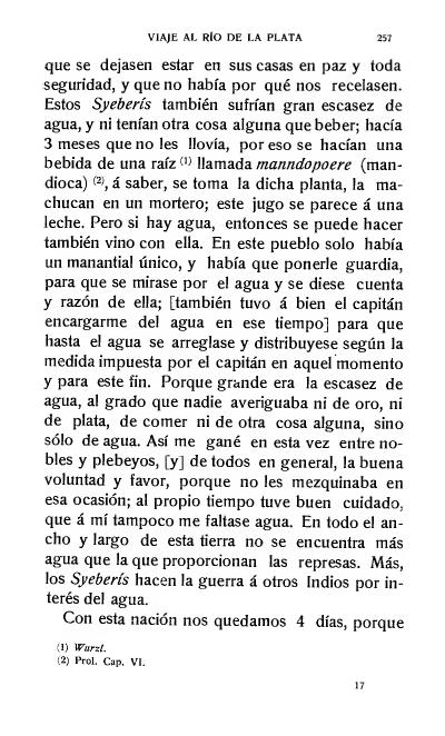 que se dejasen estar en sus casas en paz y toda seguridad, y que no había por qué nos recelasen. Estos Syeberís también sufrían gran escasez de agua, y ni tenían otra cosa alguna que beber; hacía 3 meses que no les llovía, por eso se hacían una bebida de una raíz llamada manndopoere (mandioca) á saber, se toma la dicha planta, la machucan en un mortero; este jugo se parece á una leche. Pero si hay agua, entonces se puede hacer también vino con ella. En este pueblo solo había un manantial único, y había que ponerle guardia, para que se mirase por el agua y se diese cuenta y razón de ella; [también tuvo á bien el capitán encargarme del agua en ese tiempo] para que hasta el agua se arreglase y distribuyese según la medida impuesta por el capitán en aquel momento y para este fin. Porque grande era la escasez de agua, al grado que nadie averiguaba ni de oro, ni de plata, de comer ni de otra cosa alguna, sino sólo de agua. Así me gané en esta vez entre nobles y plebeyos, [y] de todos en general, la buena voluntad y favor, porque no les mezquinaba en esa ocasión; al propio tiempo tuve buen cuidado, que á mí tampoco me faltase agua. En todo el ancho y largo de esta tierra no se encuentra más agua que la que proporcionan las represas. Más, los Syeberís hacen la guerra á otros Indios por interés del agua.