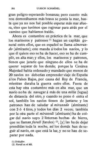 Ahora es costumbre en práctica de la mar, que los marineros y patrones hagan un capitán general entre ellos, que en español se llama almerando (almirante); este manda a todos los navíos, y lo que él quiere eso se ha de hacer, eso se ha de cumplir, en alta mar; y ellos, los marineros y patrones, tienen que jurarle que ninguno de ellos se ha de querer separar de los demás; porque la Cesárea Majestad había ordenado y mandado que menos de 20 navíos no deberían emprender viaje de España á los Países Bajos, por causa del Rey de Francia, mientras duraba la guerra entre ellos. Fuera de esta hay otra costumbre más en alta mar, que un navío no ha de navegar á más de una milla (legua) de distancia del otro, y cuando se pone ó entra el sol, también los navíos tienen de juntarse y los patrones han de saludar al miranndo (almirante) con 3 ó 4 tiros, y todos los días 2 veces; también por la otra parte el miranndi (almirante) ha de colgar del navío suyo 2 linternas hechas de hierro, que se llaman farall (faroles), [y] las ha de dejar prendidas toda la noche, así los demás han de seguir al navío, en que está la luz, y no se han de separar por nada.